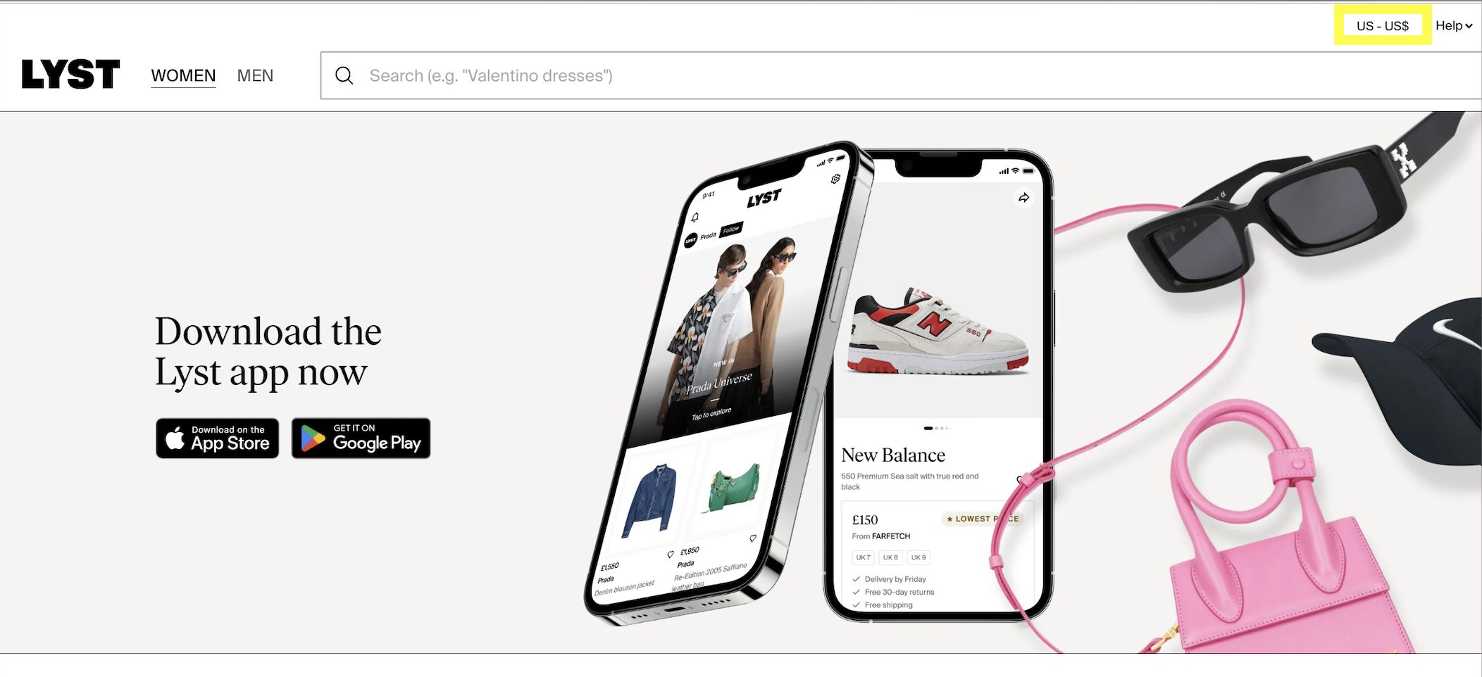 On www.lyst.com the first thing to check is whether you are searching in the correct region (as circled in the top right hand corner of the homepage). For example if you are integrated in the US, US-US$ should be selected.